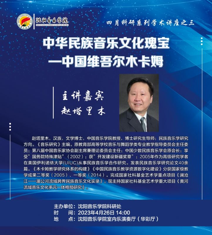 嘉宾简介:赵塔里木,汉族,文学博士,中国音乐学院教授,博士研究生导师;民族音乐学研究方向。《音乐研究》主编。原教育部高等学校音乐与舞蹈学类专业教学指导委员会主任委员;第八届中国音乐家协会副主席兼理论委员会主任;中国少数民族音乐学会原会长;享受”国务院政府特殊津贴”(2002);获”开发建设新疆奖章”;2005年作为高级研究学者在美国伊利诺依大学(UIUC)从事民族音乐学合作研究。发表民族音乐学研究论文40余篇。《木卡姆教学研究体系的构建》《中国民族音乐教学资源数字化建设》分获国家级教学成果二等奖(2005)、一等奖(2014 )。完成国家社科基金艺术学重点项目《澜沧江一一湄公河流域跨界民族音乐文化实录》。现主持国家社科基金艺术学重大项目《黄河流域音乐文化多元一体格局研究》。