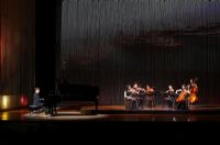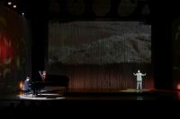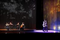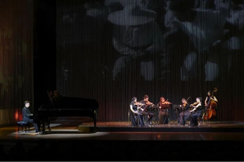 演颂会在我院室内乐团演奏的《延安颂》中拉开序幕。乐曲气势宏大、委婉流畅,将抒情性与战斗性有机融合,追溯了延安红色血脉,抒发了中国青年对祖国美好未来的无限憧憬之情。著名演播艺术家房明震在钢琴与中提琴唯美的乐曲中,满怀激情地朗诵了毛主席诗词《沁园春·雪》。全词融议论、抒情于一炉,大气磅礴、感情奔放,颇能代表毛主席诗词的豪放风格。弦乐四重奏《游击队之歌》旋律轻松流畅、生动活泼,节奏感强,与舞蹈演员不同的状态切换相融合,表达了游击队员灵活与敌人周旋、伺机消灭敌人的典型形象。