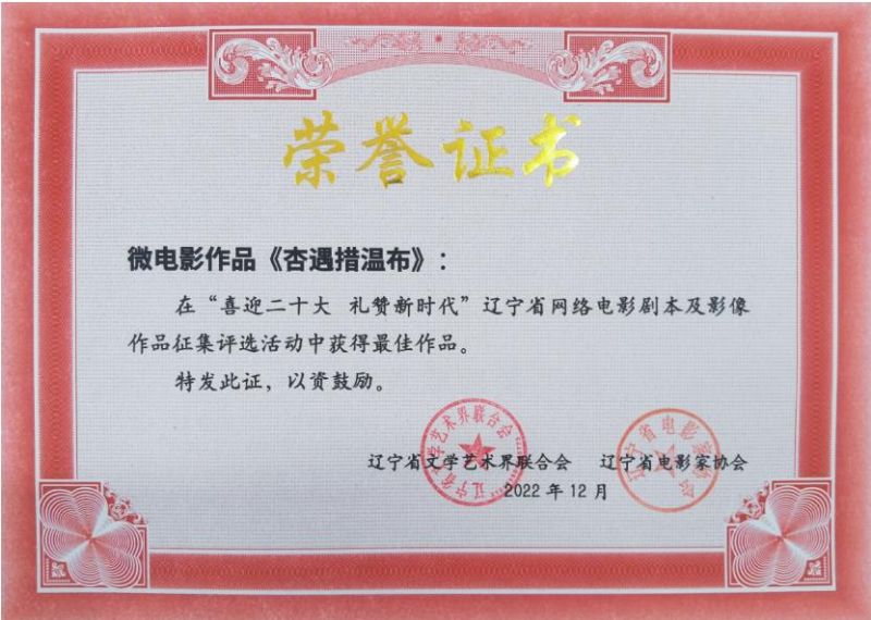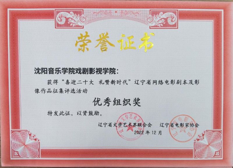 在由辽宁省文联、省电影家协会主办的“喜迎二十大礼 赞新时代”辽宁省网络电影剧本及影像作品征集评选活动中,戏剧影视学院荣获“优秀组织奖”。戏剧影视学院广播电视编导系2019级李依格、任麟蓉创作的《杏遇措温布》荣获影像类“最佳作品奖”。