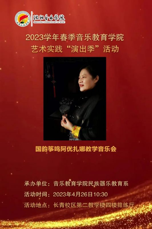 2023年4月26日,音乐教育学院民族器乐教育系“国韵筝鸣·阿优扎娜教学音乐会”在沈阳音乐学院长青校区第二教学楼排练厅举行。