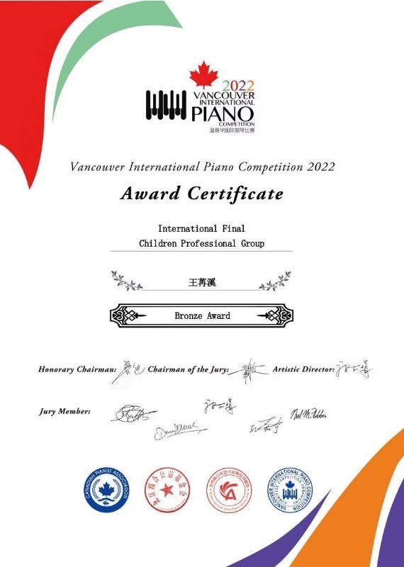 本届温哥华国际钢琴比赛由加拿大钢琴家协会、北京市青少年艺术发展专项基金联合主办。大赛邀请了美国茱莉亚音乐学院、英国皇家音乐学院、美国曼哈顿音乐学院、中央音乐学院、上海音乐学院、中国音乐学院、星海音乐学院、武汉音乐学院、浙江音乐学院等国内外顶级音乐院校的权威专家及钢琴家组成评委团。疫情防控期间采用线上的方式,吸引了5000余名国内外优秀选手参赛,搭建了实现钢琴梦想的国际舞台。在此向获奖的王苒溪同学及其指导教师张芳教授表示祝贺!