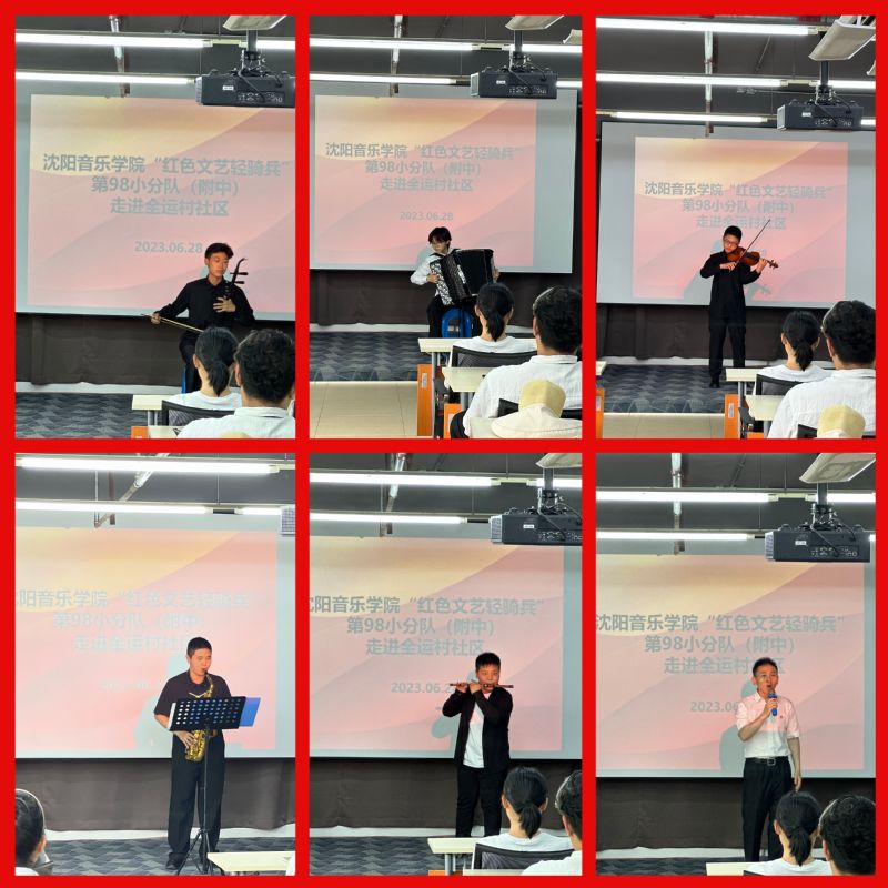 为深入贯彻落实习近平总书记在文化传承发展座谈会上的重要讲话精神,推动文化繁荣、建设文化强国、坚定文化自信。按照学院统一工作部署,附属中等音乐学校党总支充分发挥专业优势,突出特色引领,组建 “红色文艺轻骑兵”小分队,于6月28日走进沈阳全运村社区开展文艺演出。