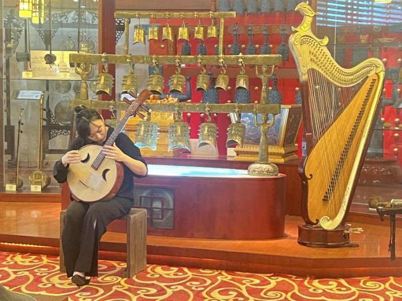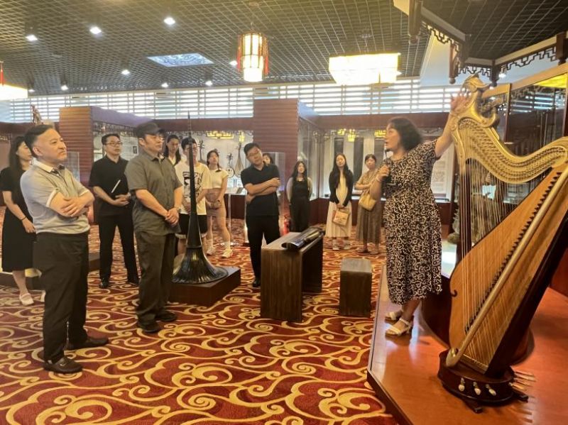 为深入学习贯彻习近平新时代中国特色社会主义思想和党的二十大精神,推进主题教育走深走实,7月4日上午,沈阳音乐学院民族器乐系党总支、鲁迅美术学院中国画学院党总支共同开展主题党日活动。两单位领导班子带领师生党员一同参观沈阳音乐学院民族乐器陈列馆,并开展交流座谈。在陈列馆里,民族器乐系学生侯湉鸽、吕妙燃为大家演奏古琴曲《酒狂》和阮曲《冰山上的来客(片段)》,讲解乐器与乐曲背后的音乐故事。座谈会上,民族器乐系主任魏国教授、党总支书记常亮和中国画学院党总支书记刘新、副院长赵斌一致表示,作为延安鲁艺继承者,民乐与中国画同根同源,担负着传承中华优秀传统文化的共同责任,未来在视觉与听觉相结合、增强艺术表现力上合作空间广阔。