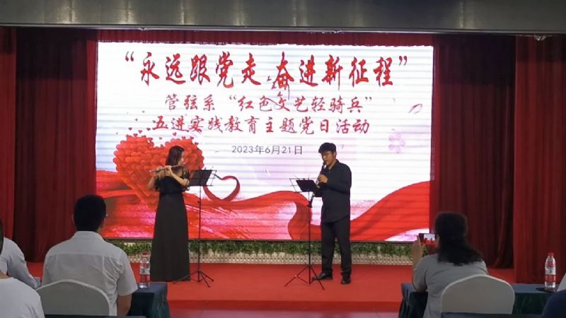活动中,我系文艺轻骑兵积极参与到“永远跟党走 奋进新征程”的志愿服务演出中,2021级学生陈子阳以单簧管独奏《苏北调变奏曲》开场,赢得观众阵阵掌声;2020级学生孙路翔演奏的《梁祝》旋律凄美婉转、荡气回肠,观众很快被带入情境;2021级学生代京辰、陈子阳合奏的《一步之遥》热情奔放,展现了当代大学生积极向上的精神面貌;2020级学生韩佳君、孙路翔合奏的《月亮代表我的心》《亲爱的旅人》、2021级学生李金泽独奏的《听海》《回家》等节目接连上阵,精彩纷呈,最后,2021级学生冉宇杰、石现表演的《我的祖国》将演出推向高潮,乐曲嘹亮,气势恢宏,赢得观众一次又一次热烈的掌声。