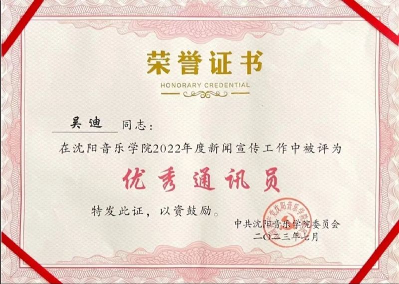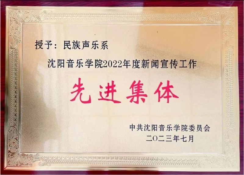 • 为进一步提升学院新闻宣传工作水平,鼓励和表彰在学院新闻宣传工作中表现积极、贡献突出的先进集体和先进个人,学院开展了2022年度新闻宣传工作先进集体、优秀通讯员和好新闻评选工作。民族声乐系被授予“2022年度新闻宣传工作先进集体”荣誉称号,吴迪同志获“2022年度优秀通讯员”荣誉称号。