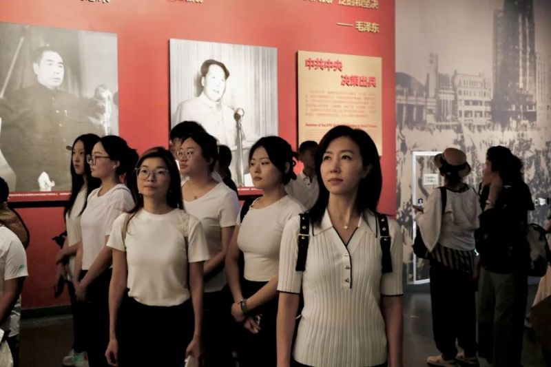 实践团成员怀着崇敬的心情,参观了抗美援朝纪念馆,一幅幅历史画卷、一篇篇历史文献,一幕幕珍贵影像,有声光影的逼真战场画面,大家不时驻足凝视,追忆革命先辈艰苦卓绝的奋斗历程,近距离感受抗美援朝志愿军舍生忘死、英勇无畏的革命精神。每张照片背后血与火的故事、每件实物承载的刻骨铭心的记忆,无不令大家感动和震撼。