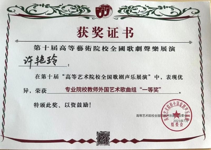 教师许艳玲荣获第十届 “高等艺术院校全国歌剧声乐展演” 专业院校教师外国艺术歌曲组一等奖。