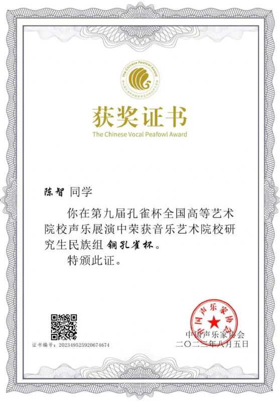 教师陈智荣获第九届孔雀杯全国高等艺术院校声乐展演,音乐艺术院校研究生民族组铜孔雀杯。