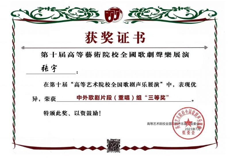 教师张宇荣获第十届 “高等艺术院校全国歌剧声乐展演” 中外歌剧片段(重唱)组三等奖。