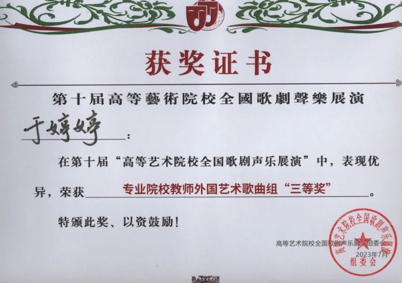 教师于婷婷荣获第十届 “高等艺术院校全国歌剧声乐展演” 专业院校教师外国艺术歌曲组三等奖。