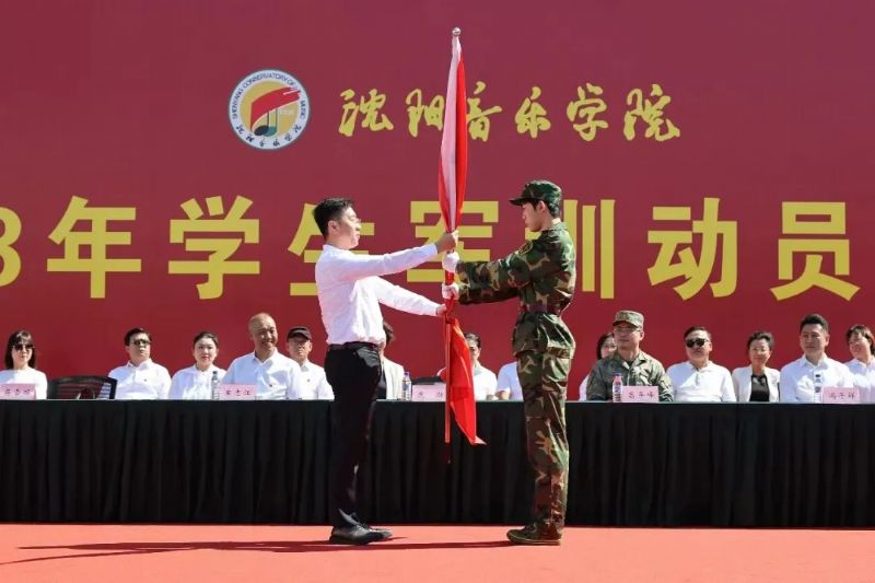 庞渤在动员大会上授旗并讲话。他首先代表全体教职员工对2023级新同学成功考入沈阳音乐学院表示热烈的祝贺。同时,向承训部队领导和教官们表示衷心的感谢。庞渤表示,军训作为大学入学教育的“第一课”和“必修课”,不仅是培养社会主义建设者和接班人的战略工程,更是提高大学生综合素质的基础工程,对于培养学生爱国主义精神、集体主义精神、艰苦奋斗精神,促进学生全面发展,有着极其重要的意义。在开训之际,他向全体参训学生提出希望。一是要传承红色基因,端正军训态度。希望同学们积极践行“紧张、严肃、刻苦、虚心”的校训精神,以饱满的精神和崭新的风貌全身心地投入到军训之中。二是要树立国防观念,明确军训意义。希望同学们身怀理想抱负,肩负报国责任,不断增强全民国防观念,强化爱国强军意识和责任担当。三是要勇担复兴大任,保证军训质量。希望同学们认真学习基本的军事技能和军事知识,遵守纪律,听从指挥,严于律己,不怕吃苦,高质量完成军训任务。最后,他勉励同学们通过此次军训,塑造钢铁意志,练就不屈精神,养成良好作风,以“青春之我”践行强国之志,以“奋斗之我”勇担时代使命,争做可堪大用、能担重任的栋梁之才。