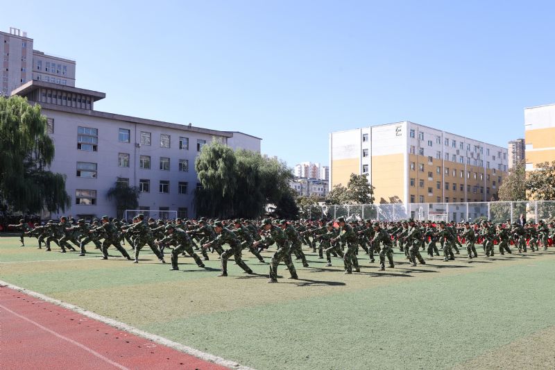 由300名女同学组成的方阵进行军体拳表演。她们动作干净利落,一招一式攻防兼备,尽展巾帼风采。今年正值学院建校85周年,女子方阵手持红色方牌,摆出“紧张、严肃、刻苦、虚心”校训,在“牢记殷殷嘱托、强国复兴有我”的青春誓言中摆出“85”字样,以此庆祝沈音建校85周年,女子方阵的精彩表演赢得现场师生阵阵掌声。男子百人方阵进行了刺杀操表演。他们手持钢枪,动作有力,士气如虹,一令一动充分展示出蓬勃向上的青春朝气。