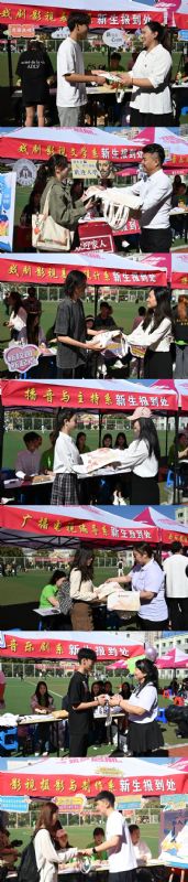 从校门行至操场、教学楼,沿途可见各院系设置的报到点,独具匠心的海报、手牌、打卡墙纷纷展现出来自沈音校园浓厚的艺术氛围。戏剧影视学院领导班子全体来到现场为新生佩戴校徽,给予新同学归属感与大学生身份的认同感。