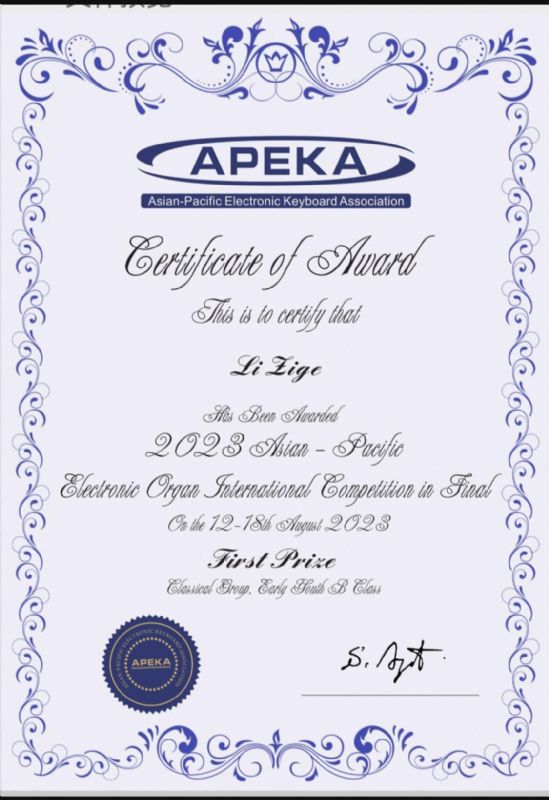 2023年8月,第八届亚太电子管风琴总决赛开幕。2023亚太电子管风琴比赛分为:选拔赛、总决赛两个阶段,选拔赛为线上比赛,总决赛(“第八届亚太电子管风琴夏令营”与“第五届亚洲电子管风琴音乐节”)于线下举行。经过专家评审最终审核,我校高三五班电子管风琴专业学生李子戈(指导教师:陈秋月)取得总决赛一等奖的好成绩! 亚太电子管风琴比赛于2011年在中国香港特别行政区首次举办,该比赛为亚太地区永久性专案,并按照国际准则,坚持权威性、导向性、公正性、大众性,是一项多元化的音乐艺术活动。旨在通过比赛及系列的学术活动,开阔国际视野,创造一个良好的学术国际交流平台,使参与者增进友谊、提高水准,以促进电子管风琴事业健康、快速地发展。