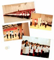 开学典礼在庄严的国歌声中拉开序幕,全体师生肃穆而立,高唱国歌。