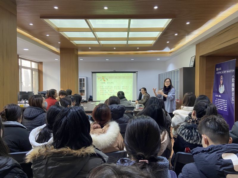 活动中,施德玉与师生们分享了她本人关于我国传统音乐的重要形式之一——曲牌音乐的研究与思考。她以语言与音乐的关系为切入点,从格律、音韵入手,回溯了曲牌音乐的形成与发展,阐述了曲牌音乐的内在结构形式、填词与制曲规则以及连曲规律等,总结了曲牌音乐的一般特征和相关剧种的创作方式,并提出曲牌音乐发展的多样性和研究视角的多元性。最后,施德玉指出,在中华民族浩瀚的艺术海洋中,曲牌音乐虽只是其中一部分,但其经过历代名家的不断雕琢形成了缜密的结构,留下了鲜明的文化印记,是具有重要价值的民族文化瑰宝。