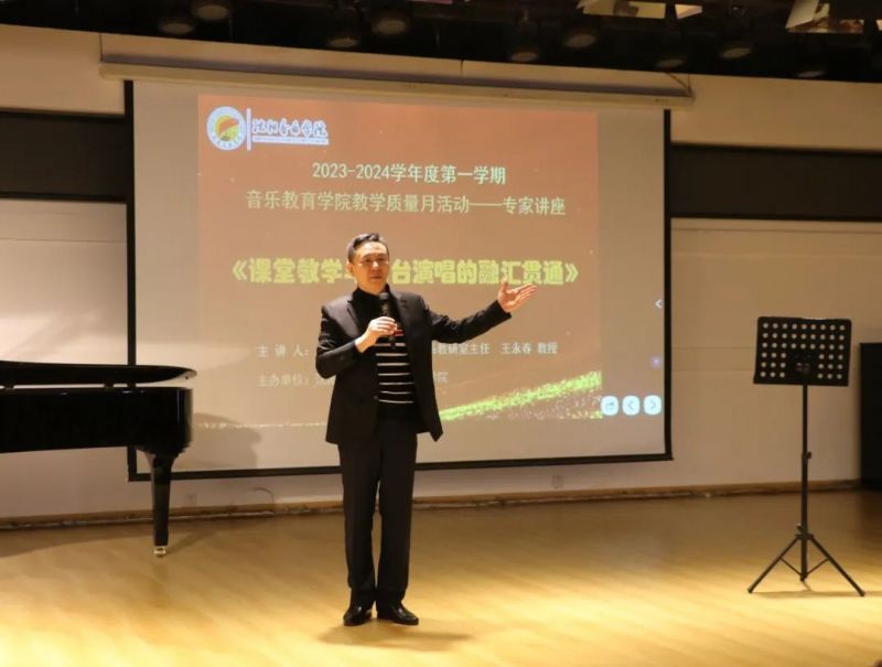 •        应沈阳音乐学院音乐教育学院邀请,男高音歌唱家、声乐教育家、硕士研究生导师、星海音乐学院民族声乐教研室主任,大学生艺术团副团长王永春教授于11月22日在长青校区举办了题为《课堂教学与舞台演唱的融汇贯通》的专家讲座。音乐教育学院院长吴家军、副院长崔姝声、副院长孙宏娟及音乐教育学院相关专业师生参加活动。讲座由音乐教育学院副院长孙宏娟主持。
