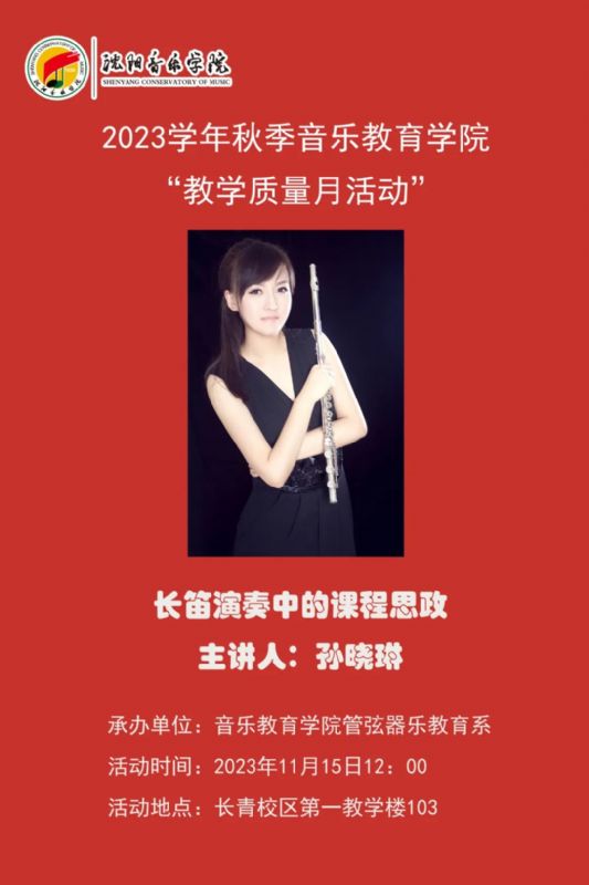 •       2023年11月15日12时,在长青校区第一教学楼103举办了《长笛演奏中的课程思政》公开课,主讲人为管弦器乐教育系长笛教师孙晓琳。