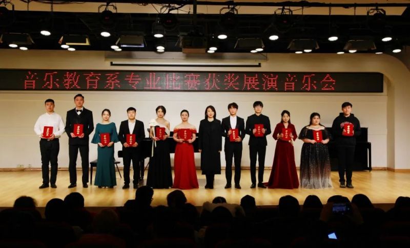 获奖展演音乐会首先由音乐教育系主任李冰、教师党支部书记张放放、学生党支部书记刘佳楠、音乐教育系副主任刘杨、贾坤分别为各组别获奖选手颁发荣誉证书,随后部分获奖选手进行了舞台展示,音乐教育系全体师生参加本场活动。