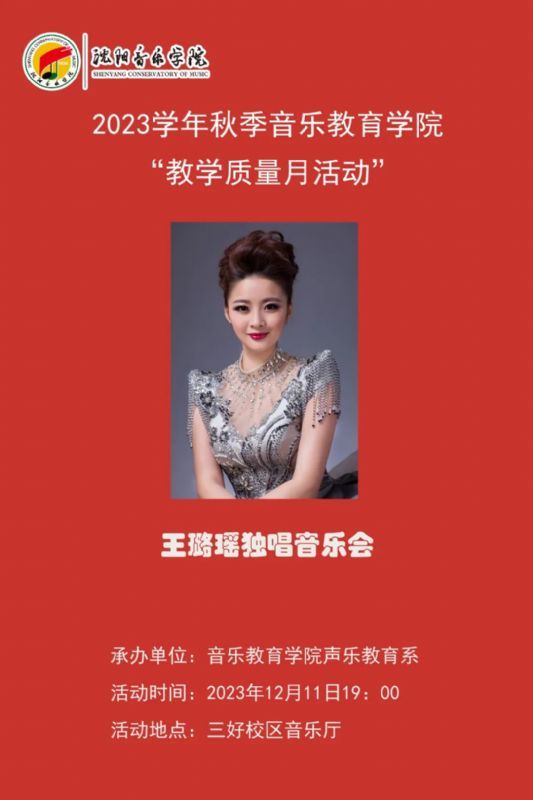 •       2023年12月11日在三好校区音乐厅举行了王璐瑶独唱音乐会。声乐教育系张悦老师担任艺术指导,特邀宋志奇、李雯隽、张蕾老师作为嘉宾。
