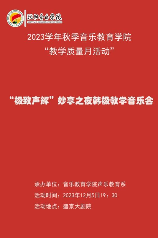 2023年12月5日19:30,沈阳音乐学院音乐教育学院声乐教育系教师韩极在盛京大剧院举办了《“极致声辉”妙享之夜韩极教学音乐会》,声乐教育系师生到场观看。