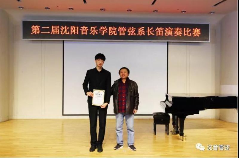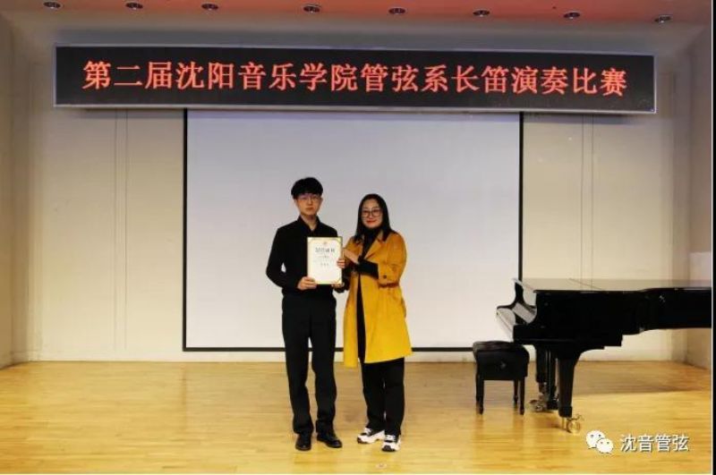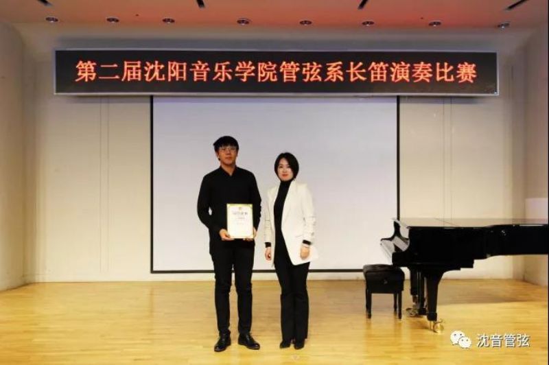 沈阳音乐学院音乐教育学院长笛教师孙晓琳为获得第六名选手 2018级学生马克颁发获奖证书