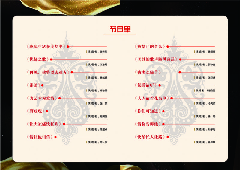 本场音乐会由本科16名学生精彩演唱了经典的歌剧咏叹调及艺术歌曲作品。音乐会精心选取了歌剧《塞维利亚的理发师》《唐璜》《费加罗的婚礼》《罗密欧与朱丽叶》《托斯卡》《西部女郎》《蝙蝠》中的精彩唱段,美妙的旋律令人不禁想起歌剧中的动人故事,感受歌剧带来的艺术享受。经典的意大利、德国、法国艺术歌曲,让学生体会到了西方古典音乐的魅力。