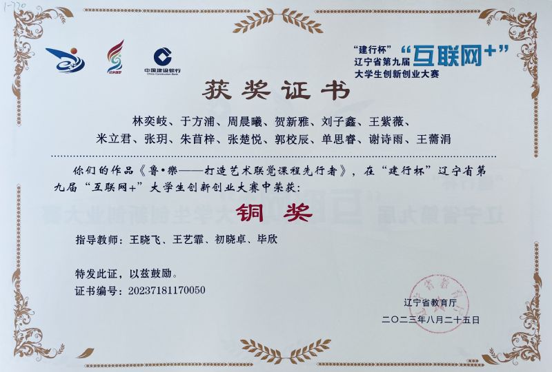 在辽宁省第九届“互联网+”大学生创新创业大赛中,我部门创新创业教研室教师初晓卓参与指导的项目《鲁•樂——打造艺术联觉课程先行者》获得铜奖。