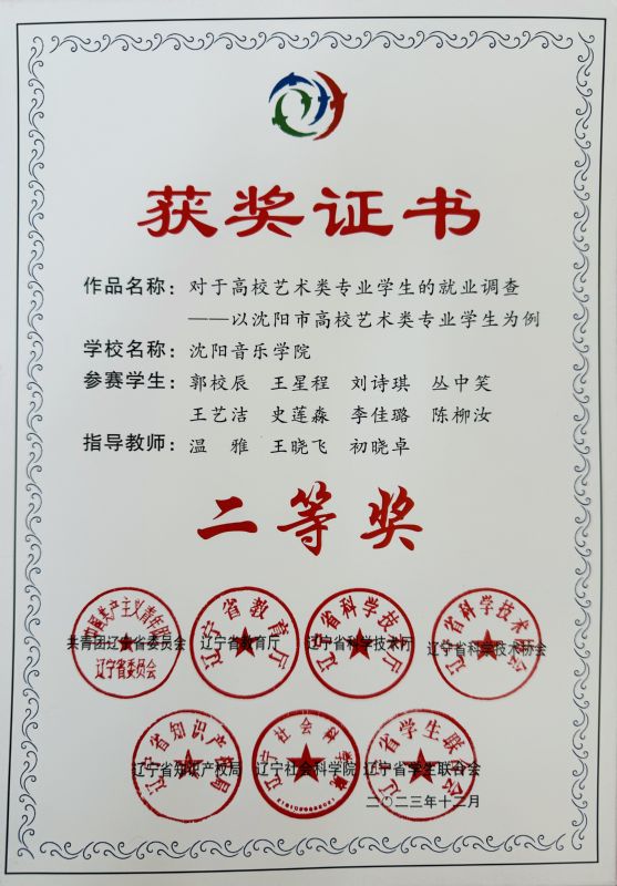 在第十六届“挑战杯”辽宁省大学生课外学术科技作品竞赛中,我部门创新创业教研室教师初晓卓参与指导的项目《对于高校艺术类专业学生的就业调查——以沈阳市高校艺术类专业学生为例》获得校级一等奖,省级二等奖,教师被评为校赛优秀指导教师。