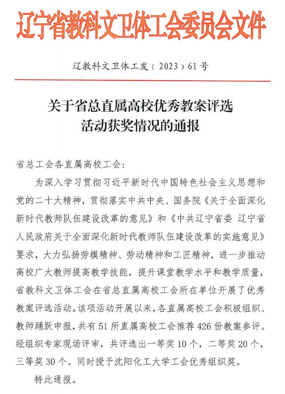 我部门教师潘晓娟在辽宁省总工会直属高校优秀教案评选活动中,荣获三等奖。