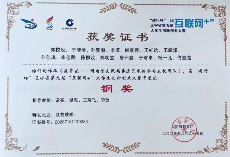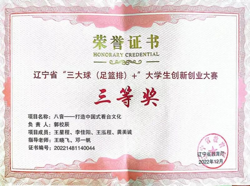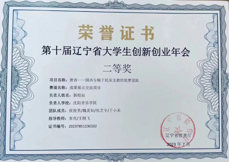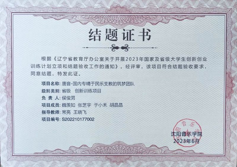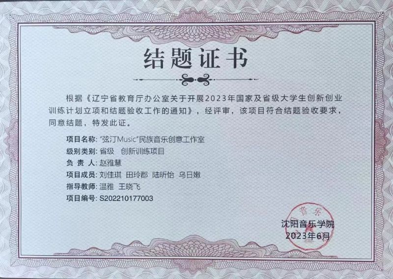2023年,在学院团委、创新创业中心的大力指导下,民族器乐系大学生创新创业成果丰硕,在省级各类比赛中斩获多项佳绩:荣获第十六届“挑战杯”辽宁省大学生课外学术科技作品竞赛一等奖1项、二等奖2项,辽宁省第九届“互联网+”大学生创新创业大赛铜奖3项,辽宁省学生身体素质提升大赛二等奖1项,辽宁省大学生创新创业年会二等奖1项,辽宁省“三大球(足篮排)+”大学生创新创业大赛三等奖1项;完成省级大学生创业训练计划结项2项。