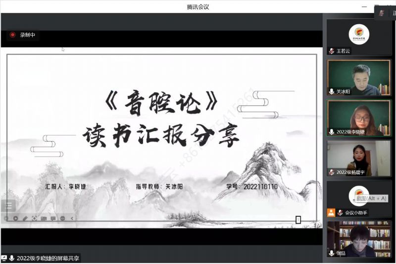 本次读书会由民族音乐理论教研室关冰阳副教授主持,关意宁、商树利、焦健等老师作为与谈人参与。在读书会伊始,音乐学系主任、音乐舞蹈研究所所长董蓉在欢迎词中表达了对嘉宾老师的欢迎与对活动中思想碰撞与交锋的期许,随后,主持人关冰阳副教授表达了本次读书会活动的举办目的,即希望营造我系静心读书、深度研讨的线上学术空间,深化我系严肃刻苦的学术氛围,并分享了自己对于《音腔论》版本异同的琐谈。