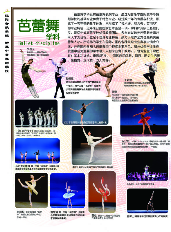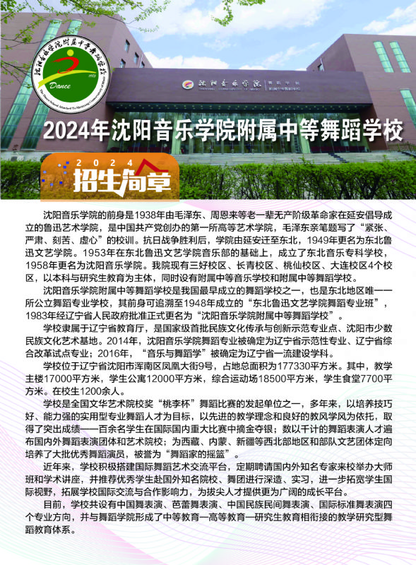沈阳音乐学院附属中等舞蹈学校是我国最早成立的舞蹈学校之一,也是东北地区唯一一所公立舞蹈专业学校,其前身可追溯至1948年成立的“东北鲁迅文艺学院舞蹈专业班”,1983年经辽宁省人民政府批准正式更名为“沈阳音乐学院附属中等舞蹈学校”。