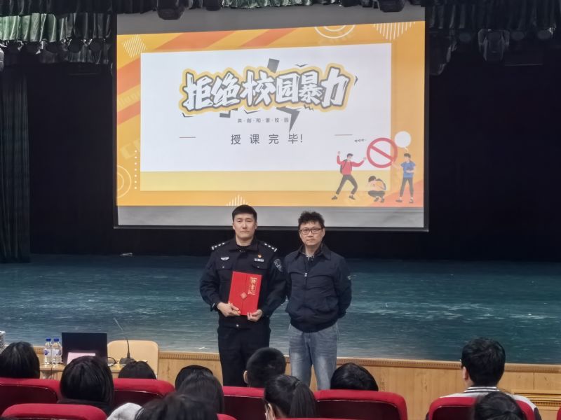 本次讲座孙铭泽警官结合青少年心理和生理特点,以案释法解释什么是校园欺凌、为什么会发生校园欺凌、怎样预防校园欺凌、校园欺凌发生后应如何应对等问题,鼓励同学们拿起法律的武器维护自身的合法权益,敢于向各类校园欺凌行为说“不”。讲座后,由保卫处王海健副处长向孙铭泽警官颁发了法治辅导员聘书。