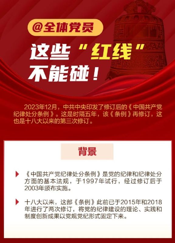 2023年12月,中共中央印发《中国共产党纪律处分条例》。这是《中国共产党纪律处分条例》时隔五年再修订,这也是党的十八大以来该条例的第三次修订。