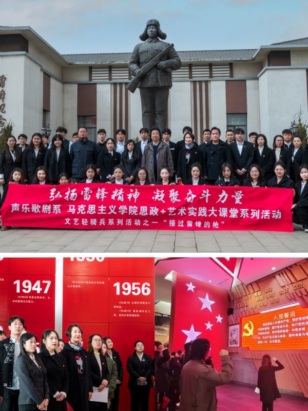 为教育引导广大党员干部师生积极践行社会主义核心价值观,持续深化拓展我院学雷锋活动,声乐歌剧系和马克思主义学院共同举办“弘扬雷锋精神 凝聚奋斗力量——思政+艺术实践大课堂”主题活动之文艺轻骑兵“接过雷锋的枪”启动仪式。在赴铁岭雷锋纪念馆开展活动中,青年师生党员群众接受了马克思主义学院青年教师的现场党课,并在党旗前开展了音乐党课活动。