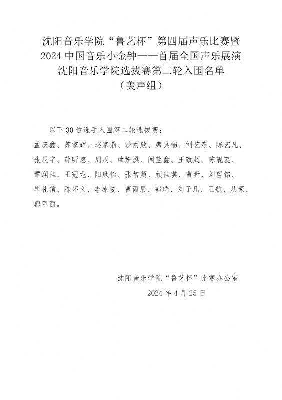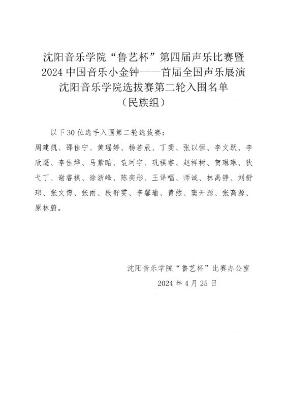 沈阳音乐学院“鲁艺杯”第四届声乐比赛暨2024中国音乐小金钟——首届全国声乐展演沈阳音乐学院选拔赛第二轮入围名单(民族组)、(美声组)