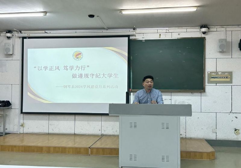 为持续推进我系学风建设,引导学生树立正确学习观念,养成良好学习习惯,端正学习态度,激发学习动力,激励学生做有理想、敢担当、能吃苦、肯奋斗的新时代鲁艺青年,钢琴系于5月8日在第二教学楼102室开展“‘以学正风,笃学力行’—做遵规守纪大学生”学风建设月主题活动,钢琴系党总支副书记辛德万、辅导员李阳、邓一帆及全体本科生参加此次活动,活动由辅导员邓一帆主持。