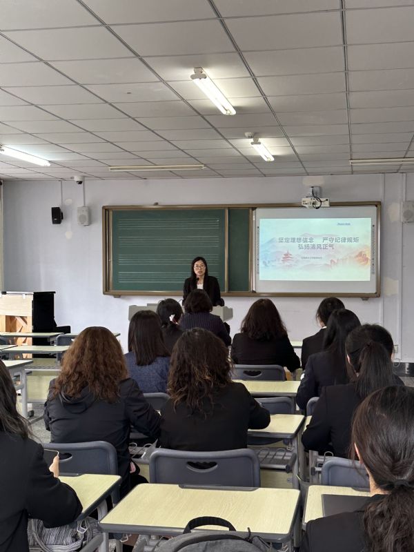 为深入学习领会新修订的《中国共产党纪律处分条例》,引导马克思主义学院党员教师明纪法、守底线,推动党纪学习教育不断走深走实,5月29日,党总支副书记丁楠在二教508为全体党员教师讲授纪律党课。马克思主义学院领导班子、全体党员教师参加会议。