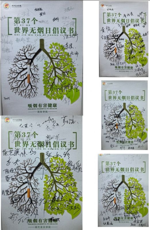 学生管理办公室制作“吸烟有害健康”、“世界无烟日”宣传展板,在我院宣传栏进行展示宣传;辅导员向学生发送相关健康科普资料链接,旨在让学生深刻领会禁烟的重要性意义。5月31日,现代音乐学院、国际学院学生签署“世界无烟日”倡议书,签下自己对维护校园无烟环境的承诺,共同倡议“无烟校园”。