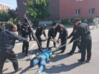 演练中,模拟一名“歹徒”不听保安劝阻,持刀闯入学校。保安员立即报告值班班长及保卫处并开展现场处置,值班班长收到通知后迅速启动一键报警器,同时组织人员持防暴装备迅速支援,采用多人合围和盾叉联动的方式与“歹徒”进行搏斗,“歹徒”被迅速制服并被带离现场。整个演练过程紧张有序,所有参演人员分工明确、行动迅速、配合默契,充分展现了学院应急处置能力,达到演练预期效果。