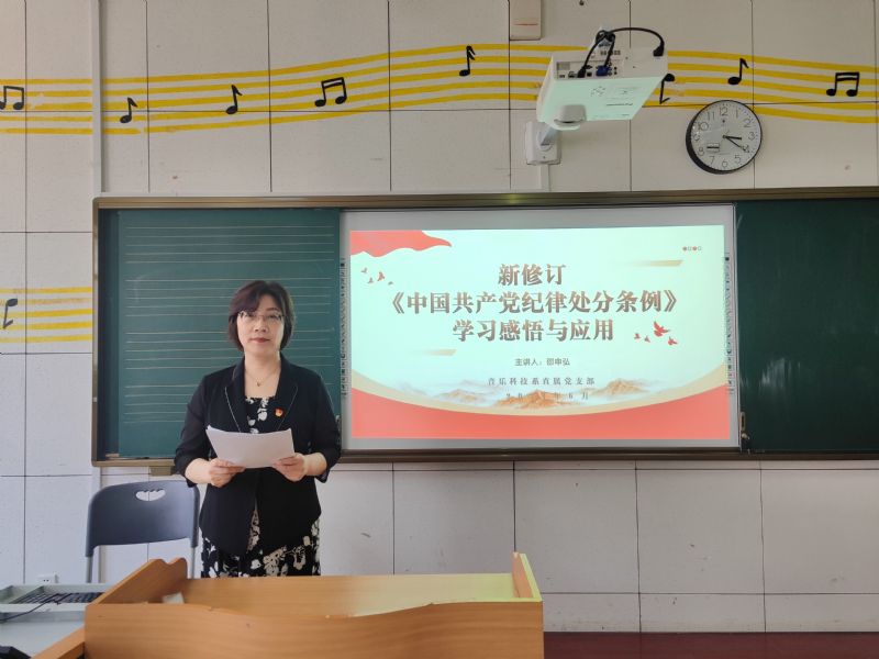 为了深入推进党纪学习教育,加强党员党性教育和纪律意识,6月17日,在长青校区第二教学楼308室,音乐科技系直属党支部成功举办了党纪学习教育党课。本次党课由直属党支部书记姚艳秋主持,音乐科技系班子成员、学生党员以及入党积极分子共同参与了此次学习。