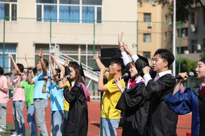 毕业典礼在激昂嘹亮、催人奋进的校歌《我们走在大路上》中落下帷幕。主席台就座的领导老师集体起身目送全体毕业生有序退场,在《再见》的大合唱中,全体毕业生依依不舍地与老师们、同学们合影留念、挥手告别。