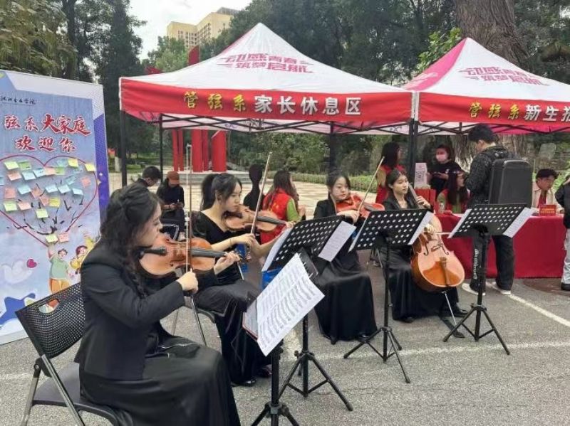 报到现场,弦乐四重奏的四位演奏同学身着优雅礼服,用悠扬婉转的旋律吸引了新生和家长们的注意。新生们纷纷驻足聆听,并表示将来一定要努力学习专业,将来成为像学姐们一样的优秀演奏者。