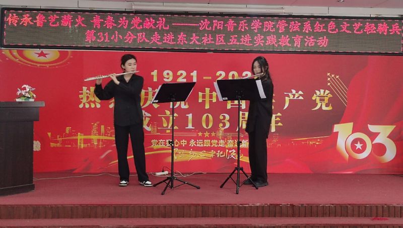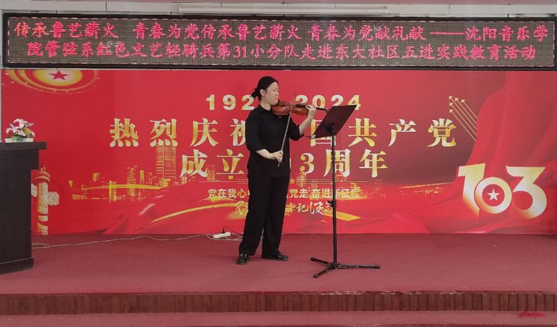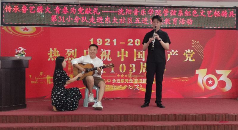 为庆祝中国共产党成立103周年,重温党的光辉历史,讴歌党的丰功伟绩,7月1日,管弦系红色文艺轻骑兵第31小分队及部分师生党员,走进和平区东大社区,开展“传承鲁艺薪火,青春为党献礼”五进实践教育党日活动。