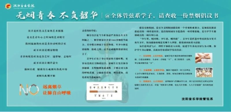 为弘扬健康文明的校园文化,提升大学生们的健康意识和自我保护能力,管弦系根据学院《关于营造“无烟青春 不负韶华”校园无烟环境的通知》工作要求,在全系范围内开展禁烟活动,打造无烟校园。