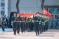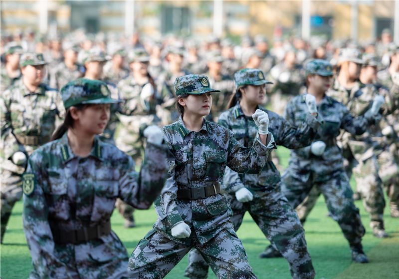 上午9时许,赵恒心宣布军训成果汇报大会开始。由音乐教育学院和现代音乐学院600名新生组成的“变字”方阵伴随着催人奋进的激昂鼓声开始表演。迷彩戎装衬英姿,凌云志起磨砺成。同学们手持红色方牌,以身为笔、以地为笺,在场地中呈现出“紧张、严肃、刻苦、虚心”的校训,一撇一捺都是脊梁,一文一墨都是骄阳,在“祝祖国生日快乐”“我爱中国”的深情告白中摆出“1949—2024”“75周年”字样,以此庆祝中华人民共和国成立75周年,精彩的表演赢得现场师生阵阵掌声。由舞蹈学院和戏剧影视学院400名新生组成的方阵在气冲云霄的呐喊声中开始了军体拳表演。同学们军姿挺拔、英姿飒爽、拳拳生风、步步有力,一招一式尽显沈音学子青春风采。八名护旗手高擎国旗、校旗入场,鲜红的旗帜在阳光下格外耀眼,二十名手持钢枪的护卫队员昂首阔步紧随其后。由各院(系)新生组成的23支军训方队依次经过主席台,进行分列式表演。学子们铿锵有力的步伐、坚毅果敢的眼神、气势恢宏的列队、响彻云霄的口号,彰显了沈音学子薪火相传、勇担使命的坚定决心和昂扬向上、自强不息的精神面貌。