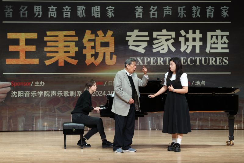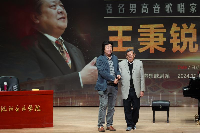 王秉锐教授还和同学们分享了自己独特的哼鸣训练和元音训练,亲自示范正确的发声技巧,帮助学生建立起自然统一的歌唱通道,增强歌唱能力。他强调,只有掌握了科学的歌唱方法,并持之以恒反复揣摩练习,就一定会越来越有进步,使自己的声音永葆青春。