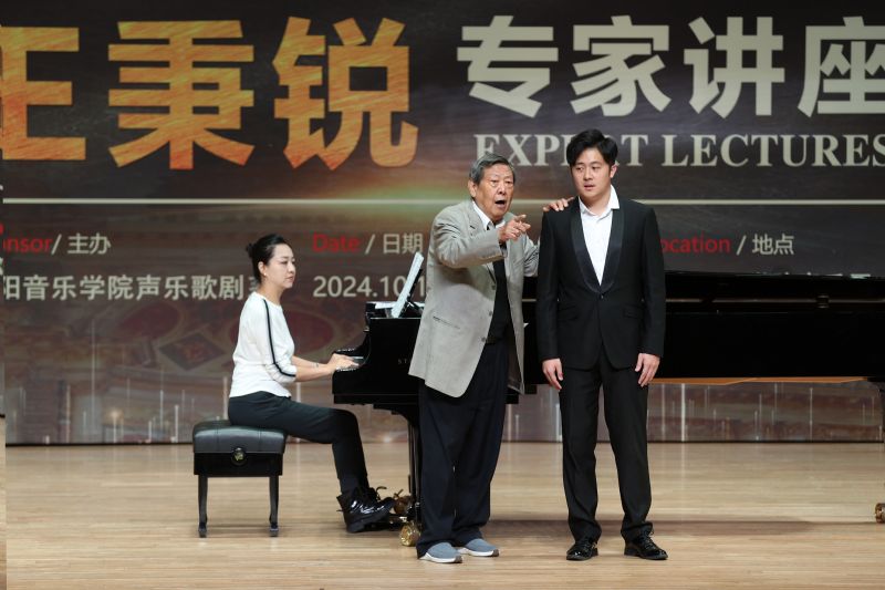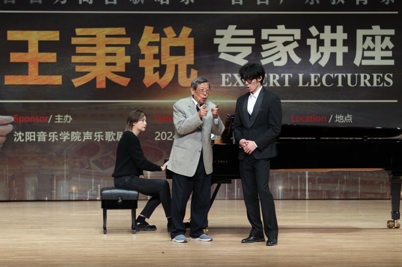 在现场教学环节,王秉锐教授对3名演唱学生进行了耐心、精准的点评,并对每位学生存在的问题做了现场纠正与调整。他以幽默诙谐的教学语言,通俗易懂的教学思路,带动了全场听众的学习热情和表演情绪,将抽象的声乐艺术演绎得直观具体形象。