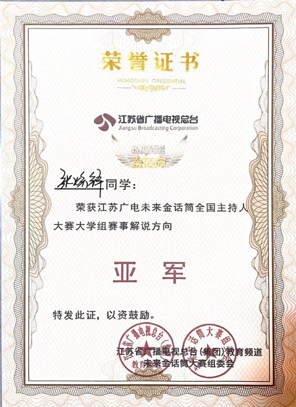 近日,在江苏省广播电视总台主办的2024年江苏广电“未来金话筒”全国主持人大赛总决赛中,我院播音与主持系2021级学生张焕铎荣获大学组(赛事解说赛道)全国亚军(指导教师:宋宇);2022级学生李紫蕾荣获大学组(晚会赛道)“全国十强”选手称号(指导教师:宋宇);2022级学生王楚晴荣获大学组“全国百强”选手称号(指导教师:刘铮)。